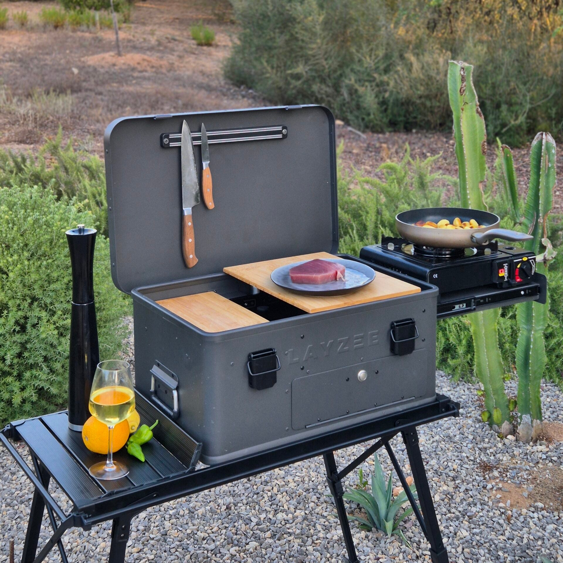 Gemaakt van massief bamboe (oppervlak) en aluminium (poten), met een geïntegreerde draaggreep